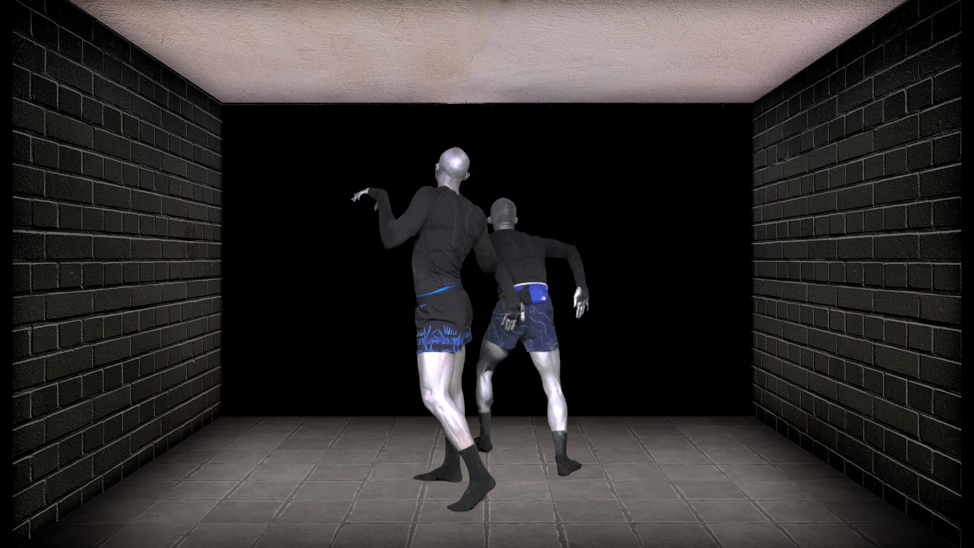 “Alien Intimacy is an exploration of the ‘distance between the physical self and digital or alien other’ which employs a myriad of motifs and post-cinematic aesthetic conventions to engender and exemplify the ‘post-human sensorium’ that is created by the extension of the physical self into the digital self and the inherent and paradoxical distance between those two selves. Here, the artists employ the conventions of the post-cinematic to engender an exemplification and personification of the post-human sensorium. Alien Intimacy at once collapses space and time, with no clear narrative or set location, flitting between digitally rendered spaces and video footage, spliced, intercut, and juxtaposed by overlaid footage of the two artists writhing, posing, dancing, and kissing. The effect is disorienting and largely nonsensical, evoking a sense of the uncanny through a myriad of implied gestures and motifs, creating affect that feels loosely disjointed, as if there were an incongruence between what the body feels and what the eye perceives. [...] At once, Alien Intimacy riffs on the physical imitation of the digital self imitating the physical self. The piece recalls the strangeness of the uncanny valley, imbuing the physical with a sense of the digital and vice versa, creating a simulacrum wherein ‘empty signs refer to themselves and where meaning and value are absent.’ In short, Alien Intimacy both embodies and engenders the affect of a ‘post-human’ sensorium, therein embodying a critique of digital culture that emanates from and dwells within the very space it seeks to assess.”